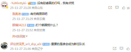 2025-11-28 00:00北京时间11月27日,中国篮协官方社媒的公示,中国男篮与韩国的世预赛第一场12人名单,中国男篮队员周琦、曾凡博、张镇麟回归,队长赵睿缺阵。中国男篮方面表示,这份名单是教练组综合考虑集训期间球员的身体状况而做出的决定。