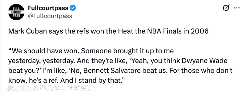 库班表示,是裁判帮热火赢下了2006年的NBA总决赛:“我们本该赢的。昨天有人跟我提起这事,就说‘你觉得是韦德击败了你们吗?’我回答说‘不,是本内特-萨尔瓦托雷击败了我们。可能有人不认识他,他是当时的裁判。我至今仍然这么认为。’”