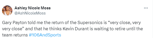 在接受采访时,加里-佩顿表示,超音速队回归联盟近在咫尺,非常非常接近,他认为杜兰特在等这支球队重现后再考虑退役。