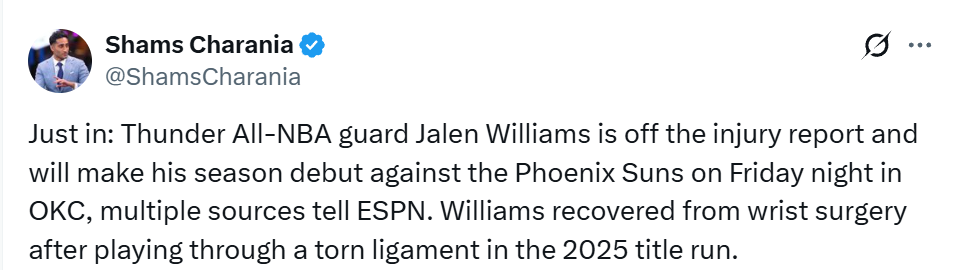 Shams还表示,NBA感恩节档喜添重磅戏码,卫冕冠军雷霆队目前以18胜1负的战绩高居联盟榜首,同时以场均+16.5的净胜分创下NBA历史前19场比赛净胜分纪录,如今,球队将迎回杰伦-威廉姆斯,与MVP亚历山大组成后场双核心。