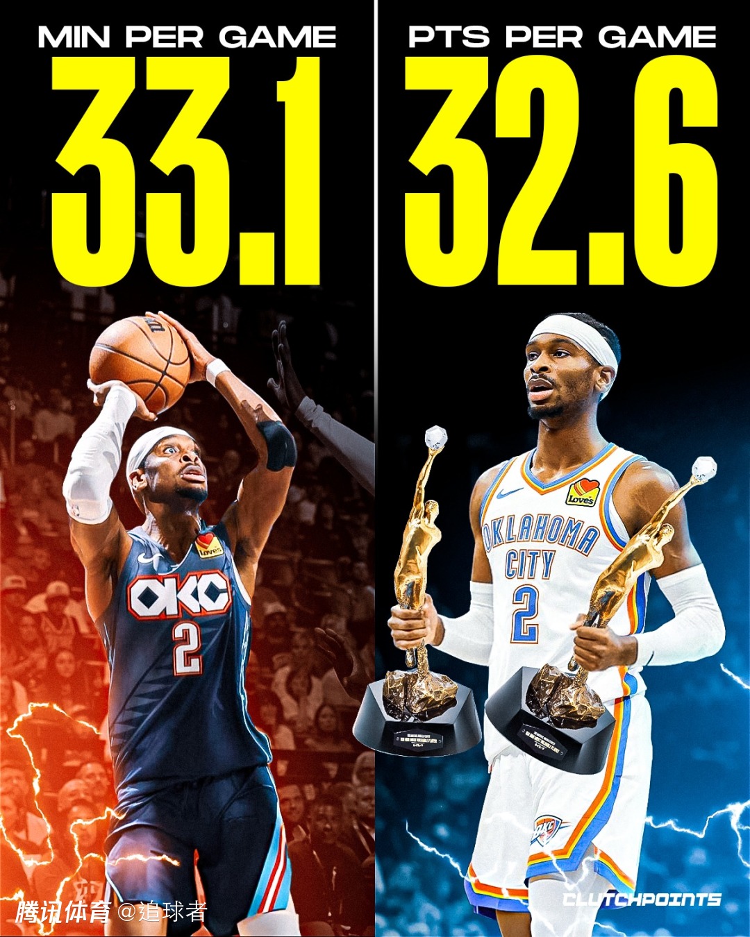 雷霆战绩笑傲全联盟,亚历山大出战了全部的19场比赛,场均登场33.3分钟,狂砍32.6分4.9篮板6.6助攻1.6抢断,即使生病也能狂砍40分带队取胜;亚历山大的得分能力太恐怖,几乎在场的每一分钟都能得分。