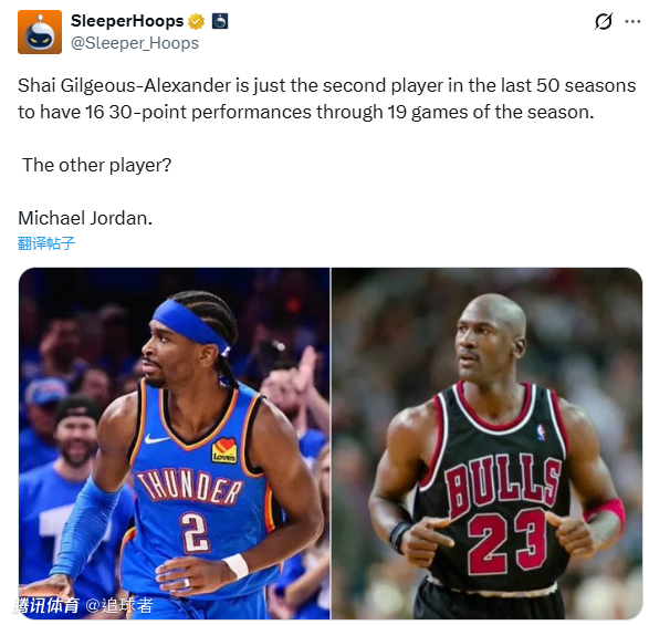 据统计,亚历山大在赛季前19场比赛中已16次砍下30+,是联盟近50年第二位在赛季前19场比赛中至少16次拿30+的球员,比肩乔丹(1986-87赛季前19场比赛,乔丹17次拿下30+)。