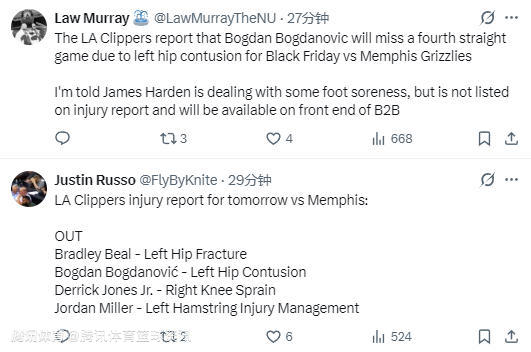2025-11-28 09:30北京时间11月28日,快船队官方公布了对阵灰熊队比赛的伤病报告,正遭遇脚部酸痛困扰的哈登并未出现在伤病报告中,快船队记者Law Murray透露他能够出战背靠背赛程的第一场比赛。