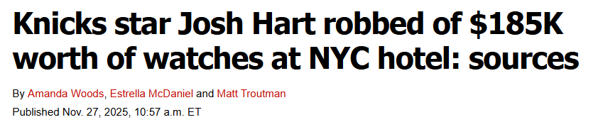 2025-11-28 10:40北京时间11月28日,据相关媒体报道,尼克斯队后卫哈特今年早些时候遭遇重大失窃案。他在纽约苏豪区多米尼克酒店的房间内,丢失了三块手表和一条手链,总价值约18.5万美元。