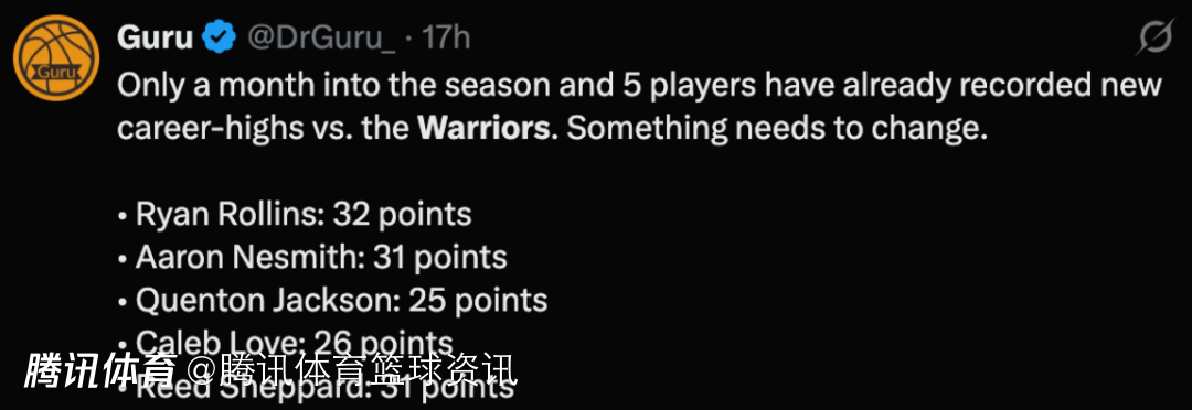 据统计,赛季才刚开始一个月,就已经有5名球员在对阵勇士时创下了个人生涯得分新高。分别是雄鹿球员罗林斯(32分)、步行者球员内史密斯(31分)、步行者球员昆顿-杰克逊(25分)、开拓者球员凯莱布-乐福(26分)、火箭球员谢泼德(31分)。