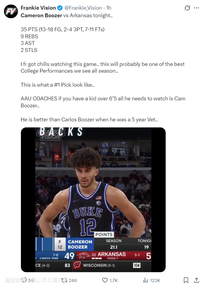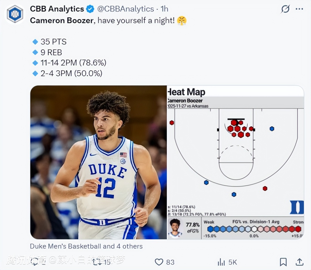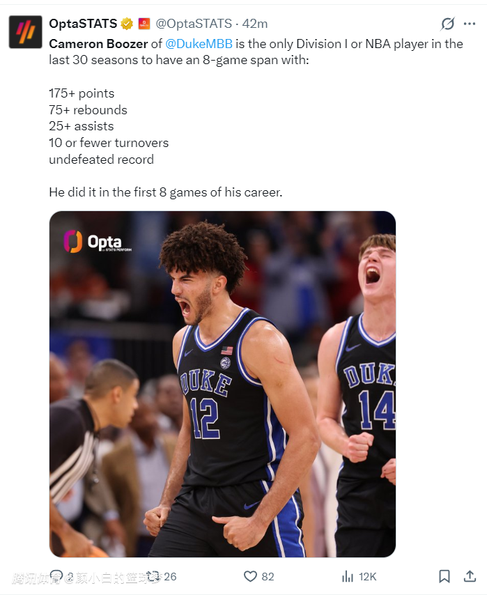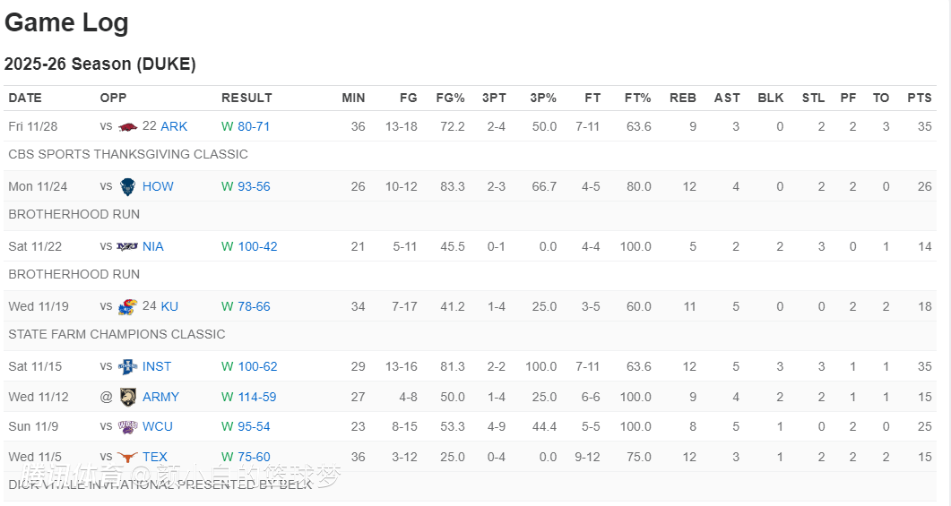 2025-11-28 13:30北京时间11月28日,NCAA继续进行,杜克大学80-71击败阿肯色大学拿到一波八连胜,这场比赛杜克蓝魔的新王卡梅伦-布泽尔发挥出色,他就开场就统治比赛,三分、突破、助攻、防守无所不能,这位6尺8的18岁少年太出色了。