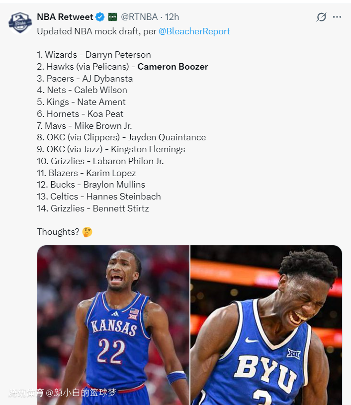 一天之前《露天看台》预测的2026年NBA选秀,卡梅伦-布泽尔是在第二顺位被老鹰选中,因为老鹰这个签是来自鹈鹕,状元还是帕特森。