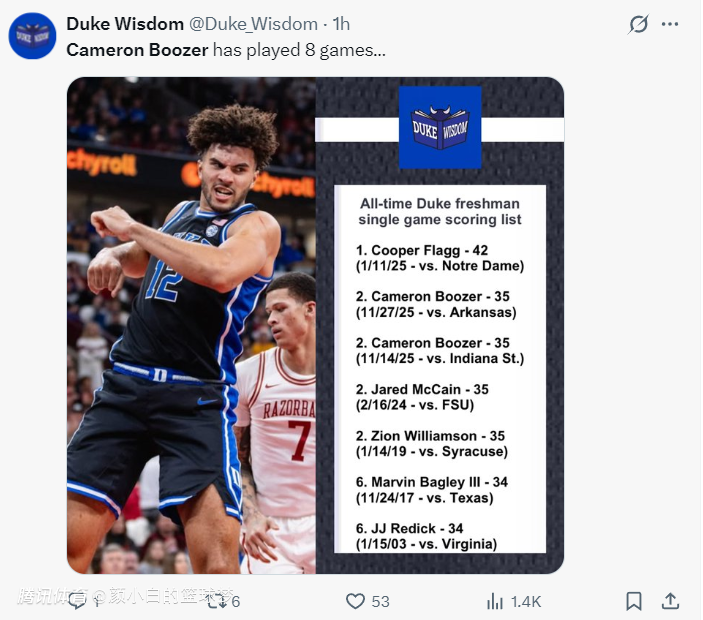他在短短两周时间内拿到两场35分,杜克大学单场得分最高的弗拉格的42分,布泽尔、锡安都拿到过35分。