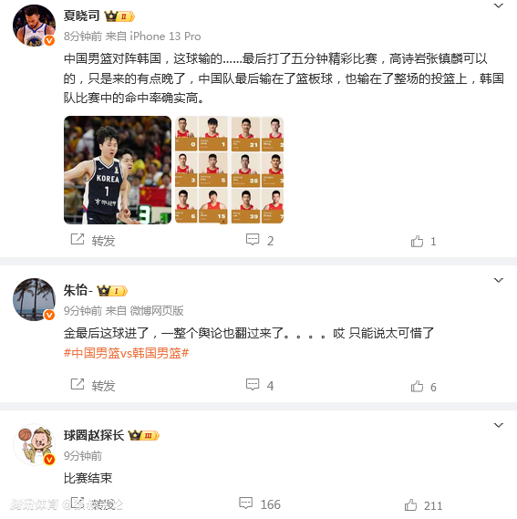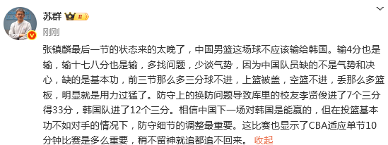 媒体人苏群发文点评:张镇麟最后一节的状态来的太晚了,中国男篮这场球不应该输给韩国。输4分也是输,输十七八分也是输,多找问题,少谈气势,因为中国队员缺的不是气势和决心,缺的是基本功,前三节那么多三分球不进,上篮被盖,空篮不进,丢那么多篮板,明显就是用力过猛了。防守上的换防问题导致库里的校友李贤俊进了7个三分得33分,韩国队进了12个三分。相信中国下一场对韩国是能赢的,但在投篮基本功不如对手的情况下,防守细节的调整最重要。这比赛也显示了CBA适应单节10分钟比赛是多么重要,稍不留神就追都追不回来。