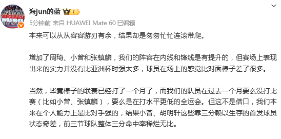 当然,毕竟棒子的联赛已经打了一个月了,而我们的队员在过去一个月要么没打比赛(比如小曾、张镇麟),要么是在打水平更低的全运会。但这不是借口,我们本来在个人能力上是比对手强的,结果小曾、胡明轩这些靠三分赖以生存的首发球员状态奇差,前三节球队整体三分命中率稀烂无比。