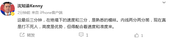 媒体人“沈知渝”发文点评:这最后三分钟,在绝境下的速度和三分,是熟悉的模样。内线两分两分凿,现在真是打不死人,高度是优势,但得配合着速度和准度来。