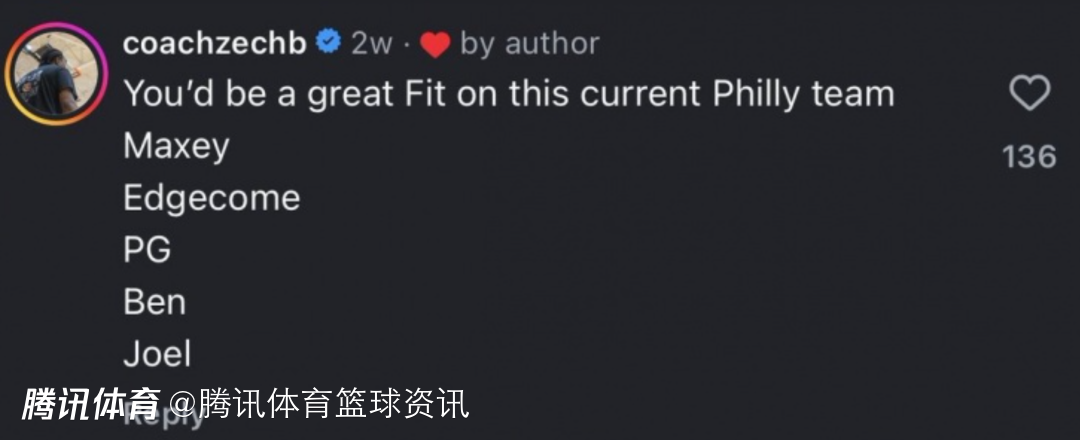 2025-11-29 01:20北京时间11月29日,近日,本-西蒙斯在自己INS评论区点赞了网友评论。该网友在评论区写道:“你很适合现在的76人,马克西+埃奇库姆+乔治+本西+恩比德。”