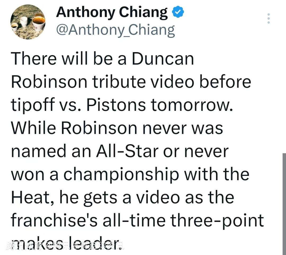 2025-11-29 08:30北京时间11月29日,据热火队记Anthony Chiang报道,在明日对阵活塞队的比赛开赛前,热火主场将播放邓肯-罗宾逊的致敬视频。