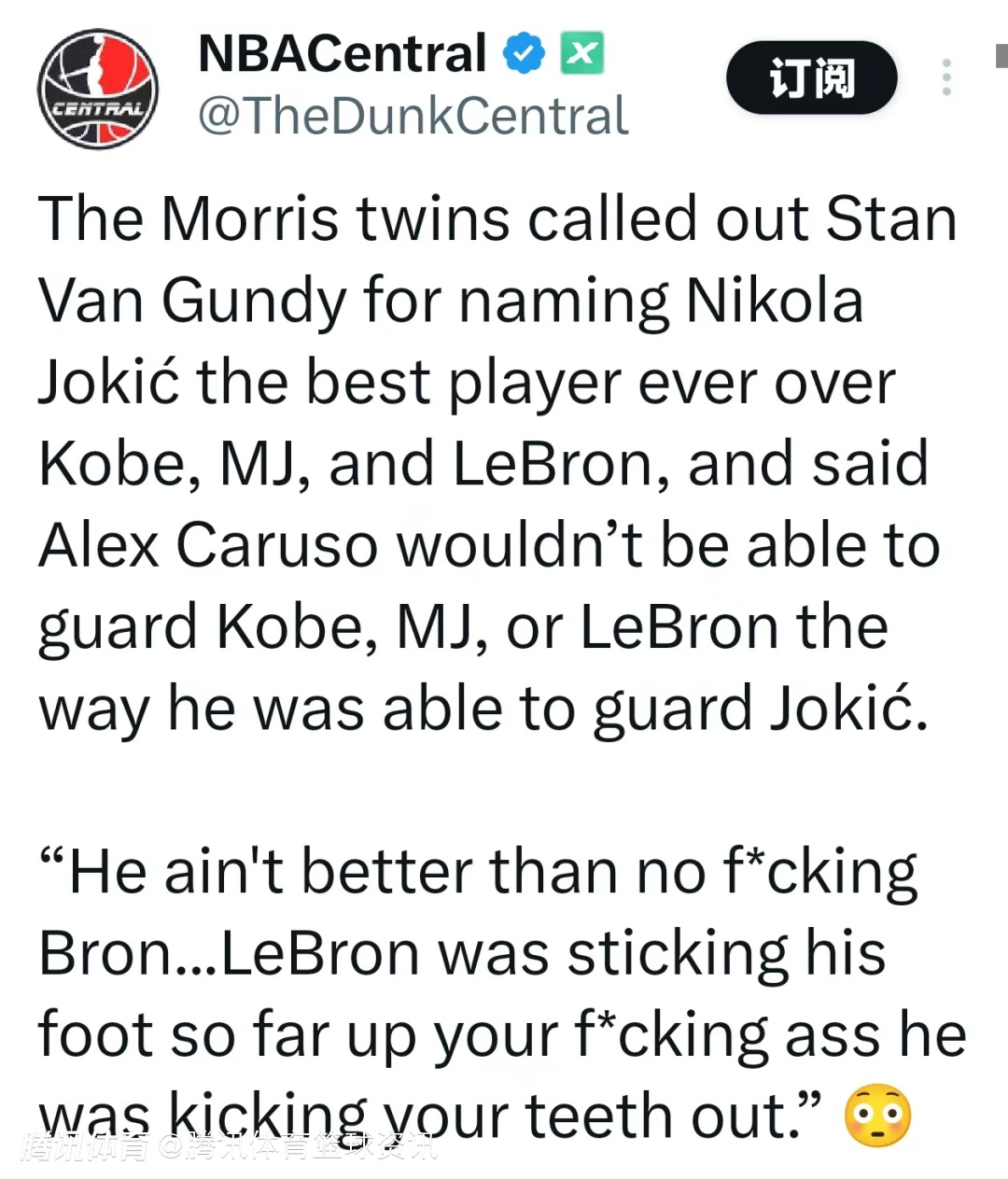 兄弟二人更怒斥:“约基奇根本不如詹姆斯,当年詹姆斯把你们按在地上摩擦,打得你们满地找牙!”