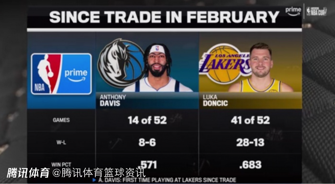 据统计,浓眉在交易后的52场比赛,仅出战14场比赛,在此期间独行侠的战绩为8胜6负,胜率为57.1%;东契奇在交易后的52场比赛,出战41场,在此期间湖人的战绩为28胜13负,胜率高达68.3%。