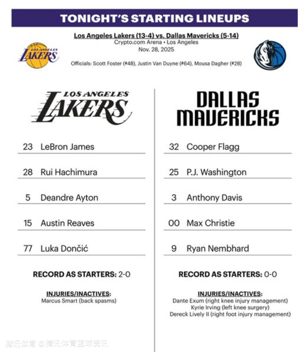 2025-11-29 10:50北京时间11月29日,NBA杯小组赛,湖人坐镇主场对阵独行侠,赛前双方的首发阵容出炉。
