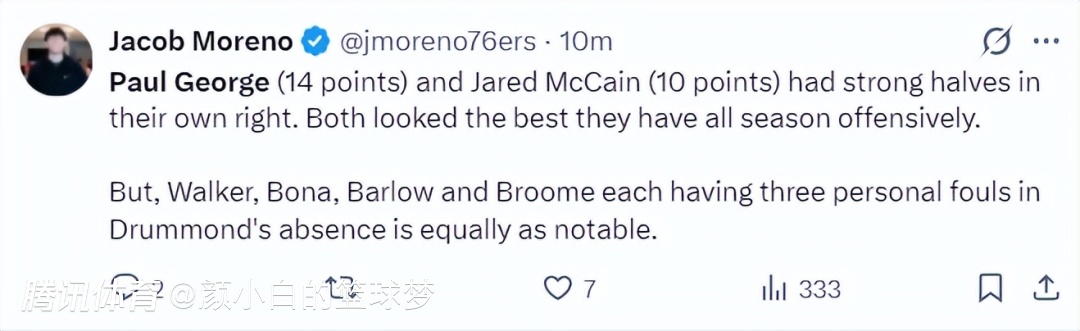 费城记者盛赞乔治半场14分、魔仙哥半场10分很出色,乔治半场8中6拿14分是目前半场得分新高。
