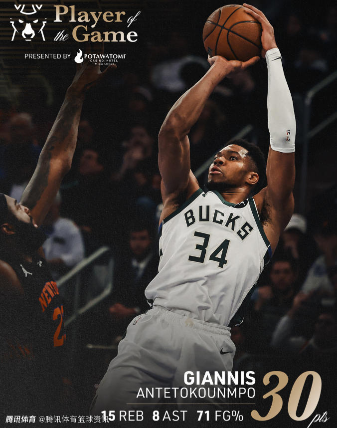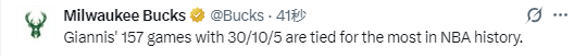 根据雄鹿队官方发布的数据统计显示,这是字母哥第157次单场砍下至少30分10篮板5助攻,并列排在NBA历史第一位。