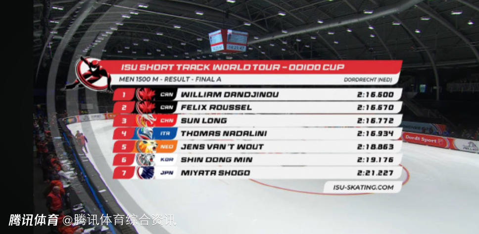 2025-11-29 22:30北京时间11月29日,短道速滑世巡赛第四站荷兰多德雷赫特,加拿大冰上枫叶队选手威廉-丹吉努成绩为2分16秒600,强势夺得男子1500米冠军,这也是他在本届4场世巡赛中收获的第3枚1500米金牌,同队队友菲力克斯-鲁塞尔位列第二(2分16秒670),中国龙队选手孙龙(2分16秒772)收获铜牌。