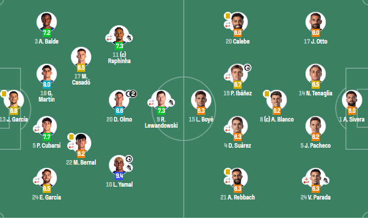 巴塞罗那(4-2-3-1):霍安-加西亚;埃里克-加西亚(46'孔德),库巴西(84'克里斯滕森),赫拉德-马丁,巴尔德;贝尔纳尔(46'拉什福德),卡萨多;亚马尔,奥尔莫,拉菲尼亚(60'佩德里);莱万多夫斯基(60'费兰-托雷斯)