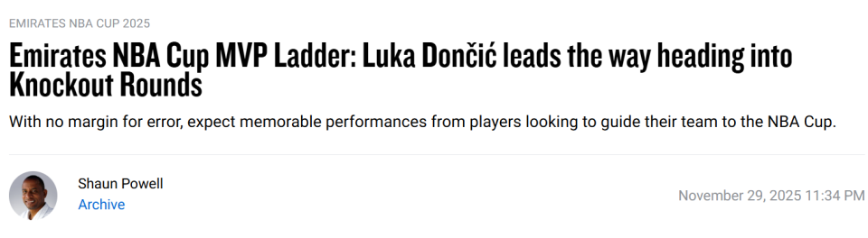NBA杯MVP排名:东契奇领跑亚历山大第二 里夫斯第四詹姆斯未上榜
