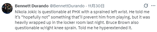 据掘金队记Bennett Durando报道,约基奇在接受采访时表示,“希望伤势不会影响上场”,但昨晚在更衣室时,其手腕已被大面积包扎。布鲁斯-布朗透露自己的膝盖出现了过度伸展的情况。
