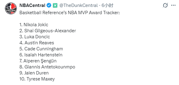 凭借出色的表现,里夫斯更是成为MVP的候选人之一,篮网数据网站BBR列出了本赛季目前的MVP榜单前10排名——1、约基奇;2、亚历山大;3、东契奇;4、里夫斯;5、坎宁安;6、哈尔滕施泰因;7、申京;8、字母哥;9、杜伦;10、马克西。
