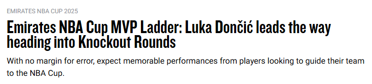 NBA官方杯赛MVP榜具体排名——1、东契奇;2、亚历山大;3、布伦森;4、里夫斯;5、英格拉姆;第6-10名依次是鲍威尔、小瓦格纳、唐斯、福克斯和吉莱斯皮。
