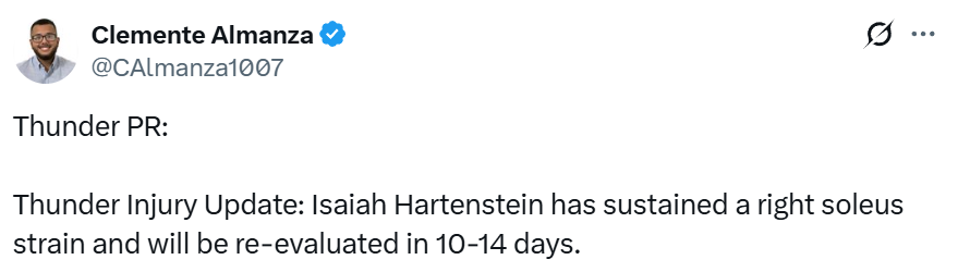 雷霆官方:哈尔滕施泰因遭遇右腓肠肌拉伤 10至14天后接受复查