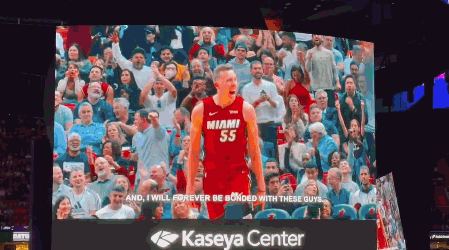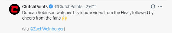 热火队为邓肯-罗宾逊制作了超过1分钟的精彩集锦,视频中包含了他在热火队效力期间的各种高光镜头。在视频播放完毕后,现场的热火球迷为邓肯-罗宾逊鼓掌欢呼,邓肯-罗宾逊也向球迷们挥手致意。