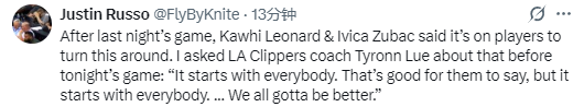 在昨日输球后,快船队近14战输掉12场,莱昂纳德和祖巴茨均表示,球员们有责任扭转当前局面。在谈到这个话题时,泰伦-卢说道:“这需要每个人共同发力。他们能这么说很好,但关键还是要所有人一起行动,我们都必须做得更好。”