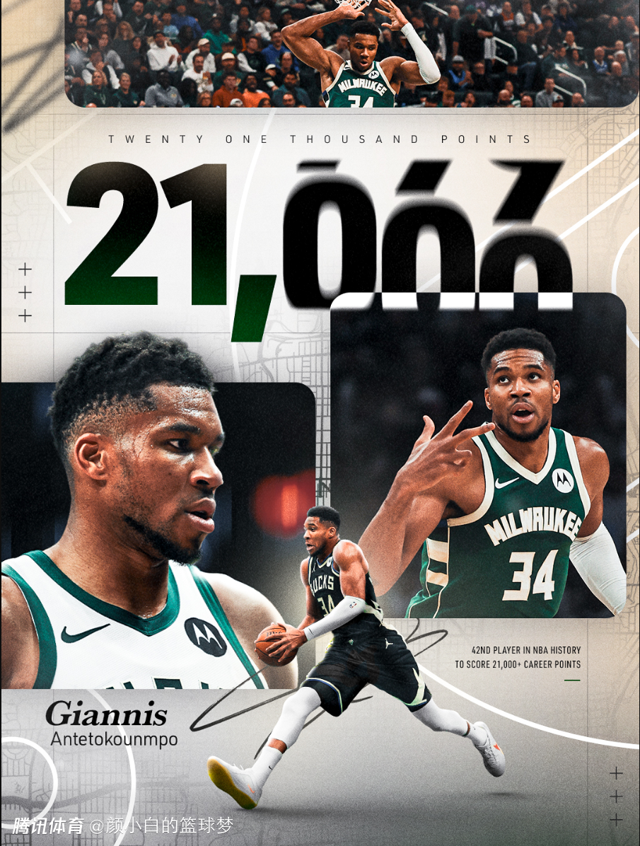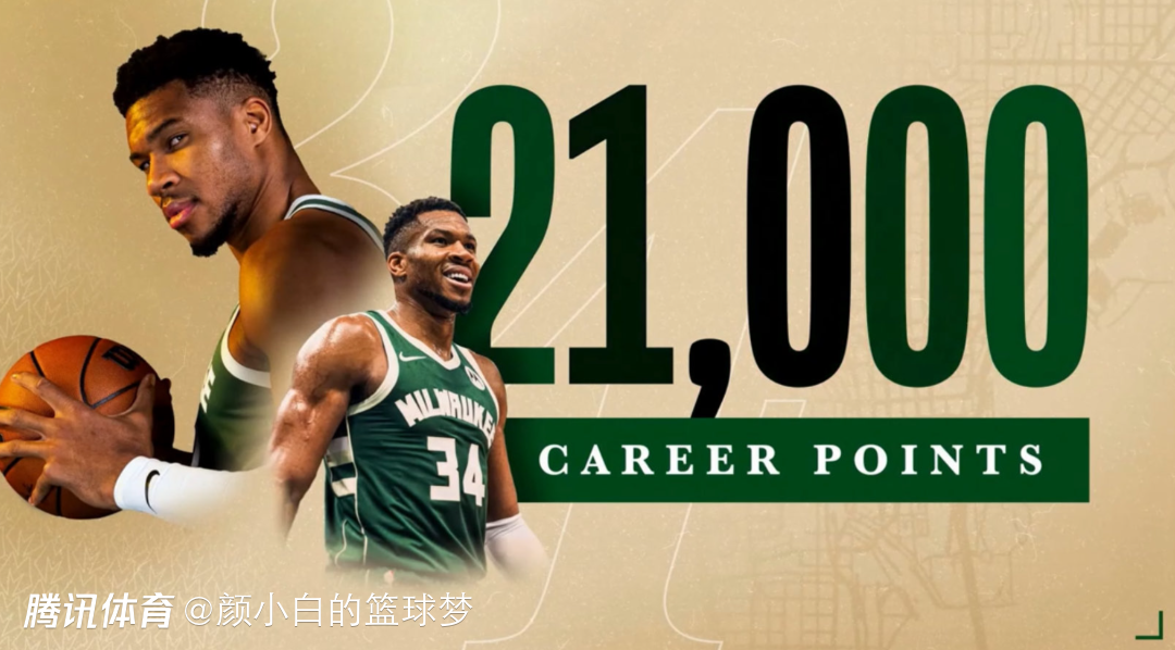 雄鹿官方晒图:扬尼斯30岁358天拿到21000分历史第六年轻,仅次于詹姆斯28岁97天,张伯伦29岁184天,科比29岁194天,杜兰特30岁23天,乔丹30岁34天。