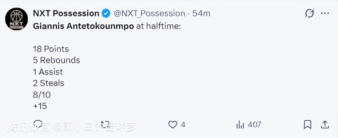 此役是扬尼斯伤愈复出的第二场,也是背靠背的第二场,昨夜他不足30分钟拿到30+,此役上半场10中8,拿到18分5篮板1助攻2抢断,命中率80%。