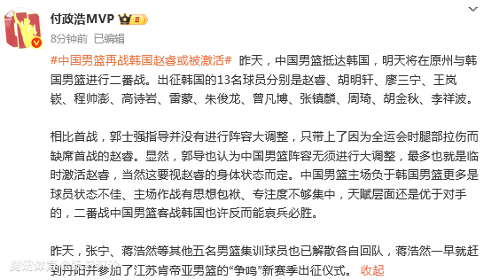 相比首战,郭士强指导并没有进行阵容大调整,只带上了因为全运会时腿部拉伤而缺席首战的赵睿。显然,郭导也认为中国男篮阵容无须进行大调整,最多也就是临时激活赵睿,当然这要视赵睿的身体状态而定。中国男篮主场负于韩国男篮更多是球员状态不佳、主场作战有思想包袱、专注度不够集中,天赋层面还是优于对手的,二番战中国男篮客战韩国也许反而能哀兵必胜。