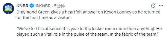 追梦在卢尼首次以客队球员身份回归时,动情谈及这位昔日队友:“今年他不在更衣室的这段时间,我们感受最深的就是他的缺席。他曾是球队节奏的核心,更是球队文化不可或缺的一部分。”