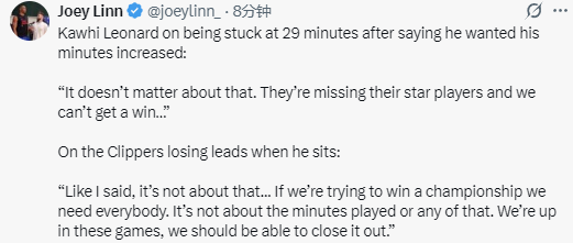 在谈到自己上场时间受限的问题时,莱昂纳德表示:“这事不重要。你看,对手的核心球员都缺阵了,我们却还是赢不了球。我们得靠全队一起发力才行,就像我之前说的,15个人都得行动起来。”