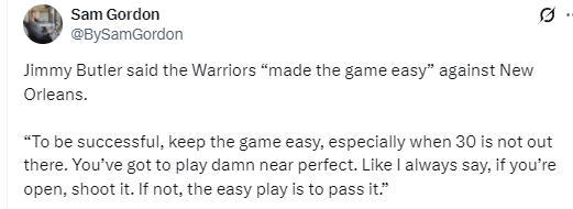 巴特勒表示:“要想赢球,就得让比赛保持简单,尤其是在30号(库里)不在场的时候,发挥得接近完美才行。就像我常说的,有空位就投,没空位的话,最简单的选择就是传球。”