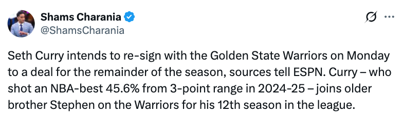 兄弟篮球来了!Shams:勇士将和塞斯-库里签约至赛季结束