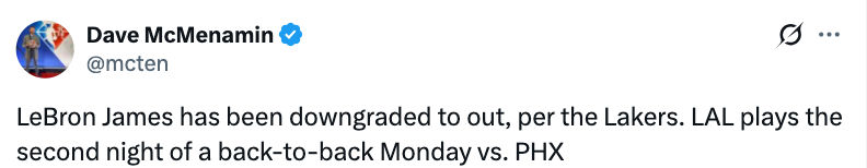 2025-12-01 00:30北京时间12月1日,据湖人队记Dave Mcmenamin报道,詹姆斯的出战状态已被下调为 “缺阵”。他将不会出战对阵鹈鹕的比赛。