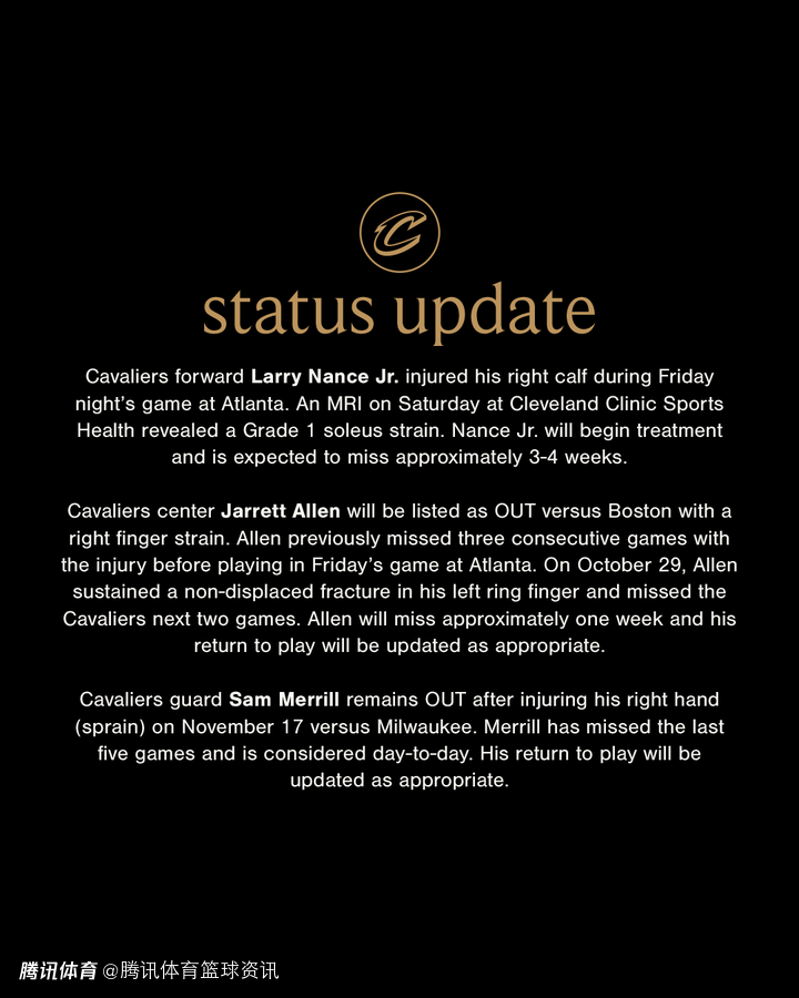 骑士队同时更新了另外两名球员的伤情:首发中锋艾伦因右手手指拉伤将缺席至少一周;射手梅里尔则因右手扭伤已连续缺席五场比赛,球队表示其目前仍无法出战,状态为每日观察。