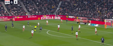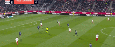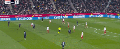 41分钟,姆巴佩小禁区前停球后扫射破门,不过姆巴佩手球在先,进球无效。