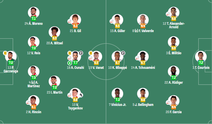 皇家马德里(4-3-3):库尔图瓦;阿诺德(90'冈萨洛-加西亚),米利唐,吕迪格,弗兰-加西亚(90'卡雷拉斯);巴尔韦德,琼阿梅尼(72'罗德里戈),贝林厄姆;居莱尔(46'卡马文加),姆巴佩,维尼修斯