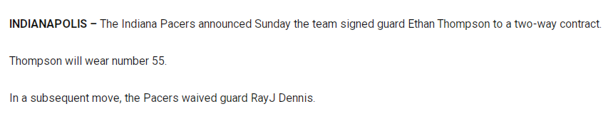 此前,据HoopsHype记者Michael Scotto报道,步行者队将与自由球员侧翼伊桑-汤普森签下双向合同,同时为腾出阵容名额,将裁掉控球后卫雷杰-丹尼斯。