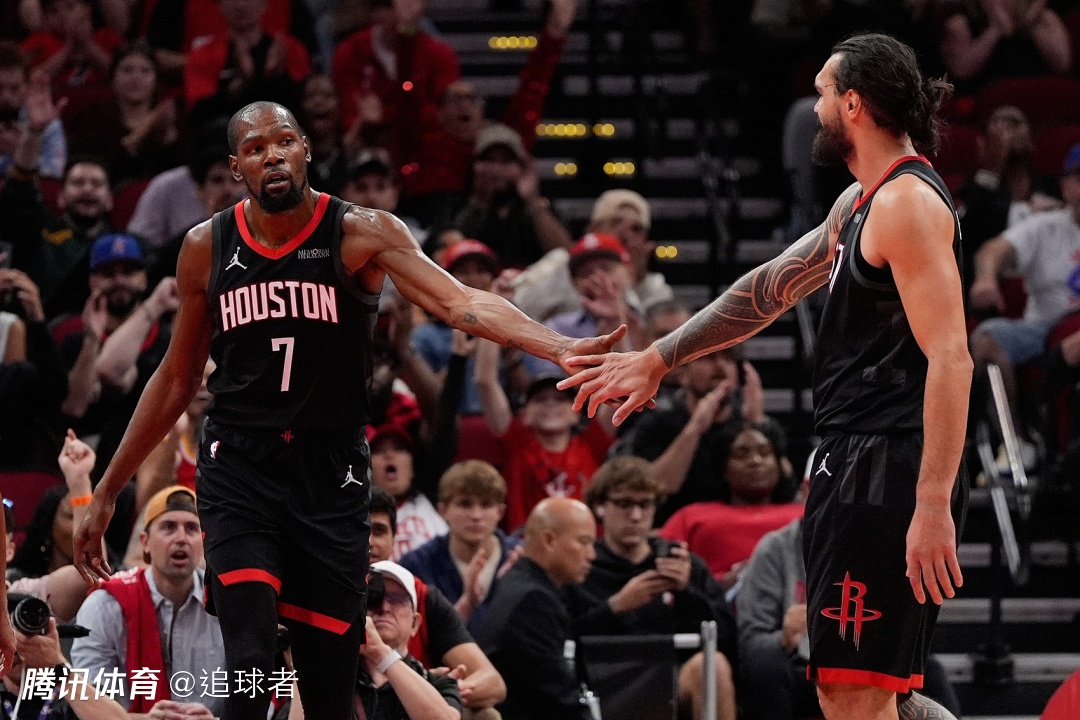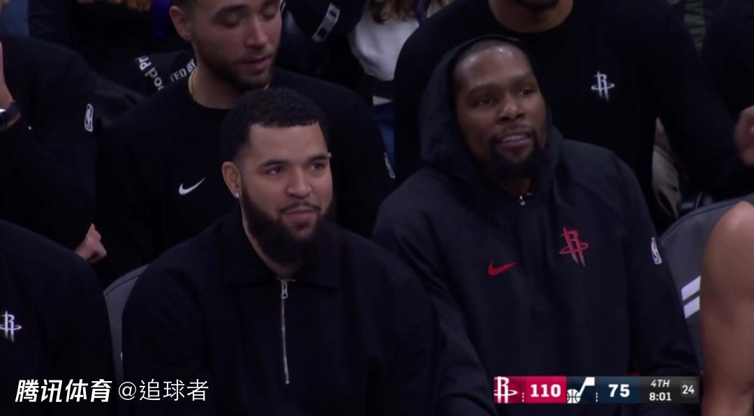 由于火箭一直大比分领先,杜兰特三节打卡下班,坐在替补席十分开心,与范弗利特轻松闲聊。