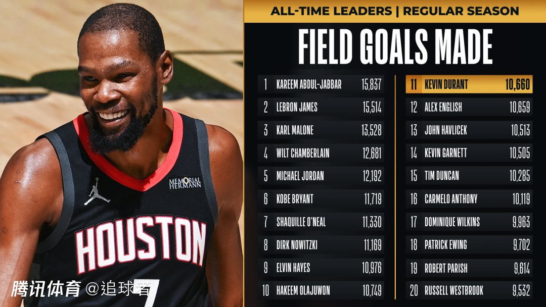 杜兰特迎来里程碑,生涯投篮命中数来到10668个,正式超越了阿历克斯-英格利什,杜兰特应该很快就能超越他。