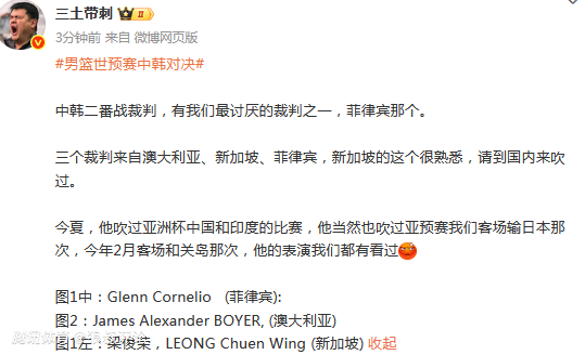 媒体人“三土带刺”发文点评:“三个裁判来自澳大利亚、新加坡、菲律宾,新加坡的这个很熟悉,请到国内来吹过。