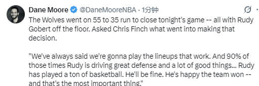 2025-12-01 11:50北京时间12月1日,NBA常规赛继续进行,森林狼队125-112击败马刺队。在本场比赛最后17分钟,戈贝尔没有出战,森林狼队却打出55-35的进攻高潮翻盘。赛后,森林狼队主教练芬奇和球员里德都谈到了此事。