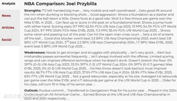 在2025年耐克EYBL中场均4.6个篮板,在2025年U19世界杯中场均4.7个篮板,在他的年级中年龄偏大,将在高四那年的5月份年满19岁。