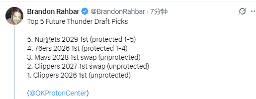2025-12-01 12:20北京时间12月1日,雷霆队记者Brandon Rahbar发文,盘点了雷霆队手中未来最具价值的5个首轮选秀权,其中前2名都来自快船队。具体情况如下: