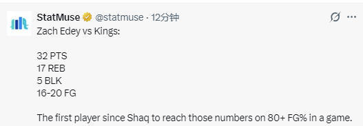 2025-12-01 12:50北京时间12月1日,NBA常规赛继续进行,灰熊队115-107击败国王队。灰熊队中锋扎克-伊迪此役20投16中得到32分17篮板5盖帽,迎来多个里程碑。